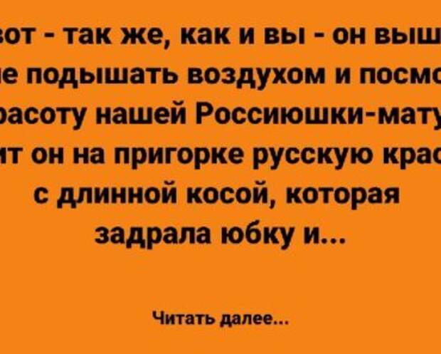 И вот — так же, как и вы — он вышел из купе подышать воздухом и посмотреть на красоту нашей Россиюшки-матушки. И видит он на пригорке русскую красавицу с длинной косой, которая задрала юбку и, извините, присела опорожниться, повернувшись своей белоснежной попой к французу.